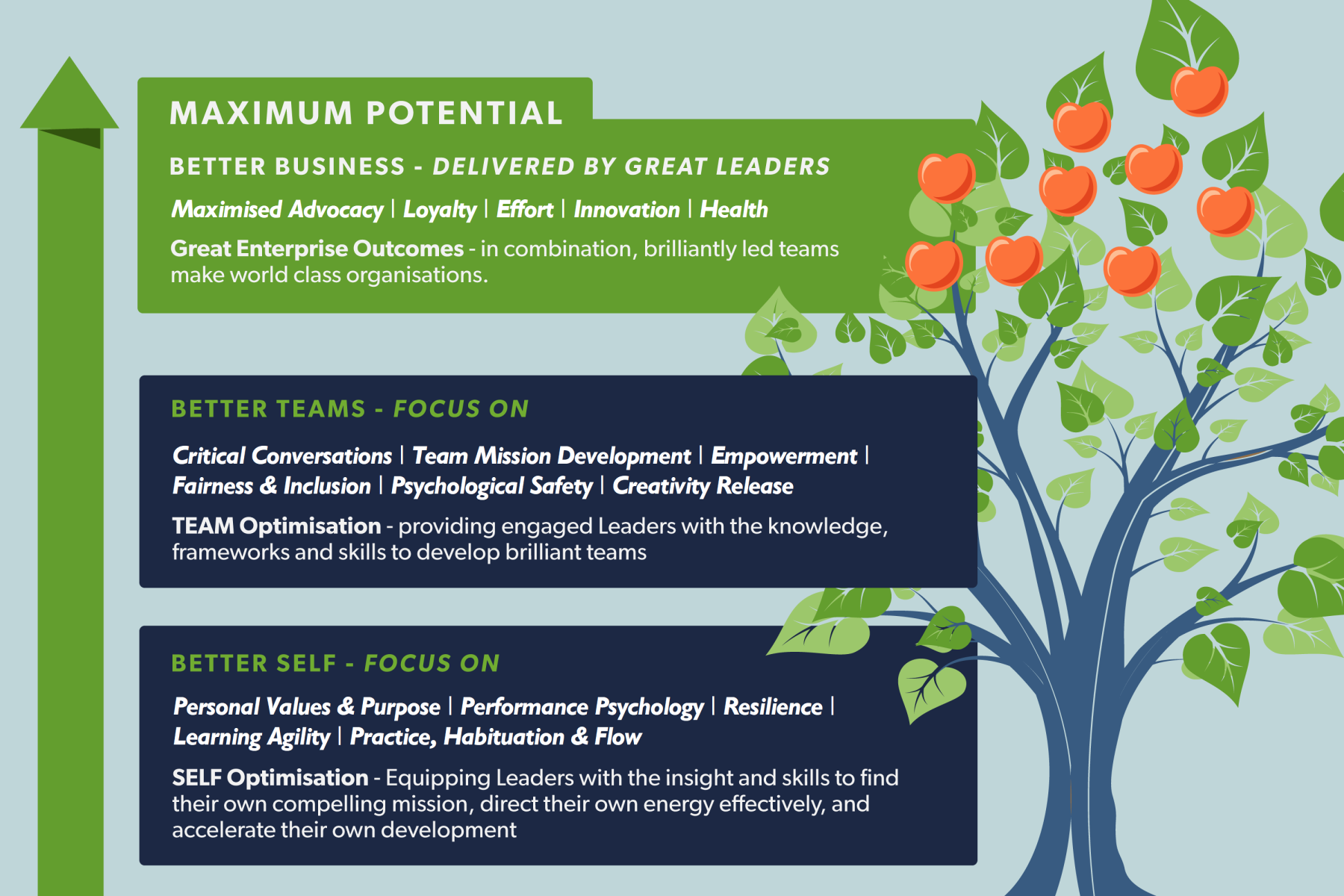 Using our own SELF-Optimisation framework, we coach individual Leaders to define their own compelling career mission, direct their own energy effectively, and accelerate their own development. The objective of this coaching is to maximise individual performance and potential. Once they are skilled navigators themselves, we also support leaders as they coach their own team members through a similar journey.